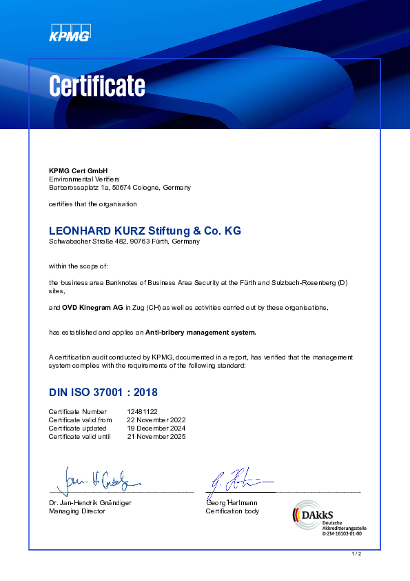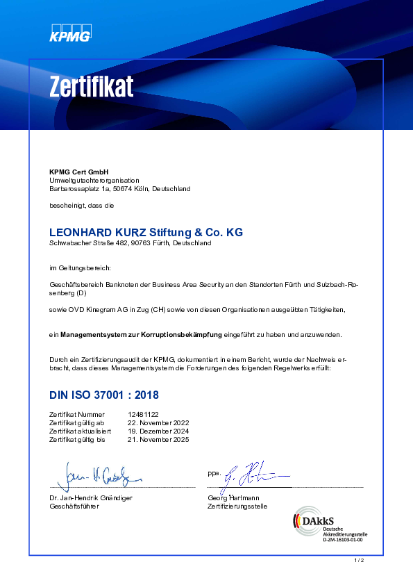 OVD Kinegram is INTERGRAF certified for high security printing, i.e. holding thei INTERGRAF organization standard WA 15374:2024 for its security management system. At the same time, OVD Kinegram has been and continues to be certified according to ISO 9001 standard for its quality management system, ISO 14001 standard for its environmental management system and ISO 14298 standard for its management of security printing processes. Together with its parent company Leonhard KURZ, OVD Kinegram is also central bank accredited for the production of high security features for banknotes.